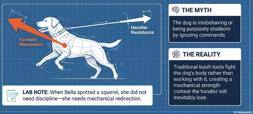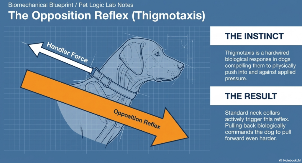 Bella isn’t being “stubborn” when she pulls against a regular collar; she’s reacting to thigmotaxis, or the technical term for opposition reflex. This is a hardwired physical instinct to lean into pressure. It is not your imagination, the dog really is pulling against you! It is in their DNA to do so.