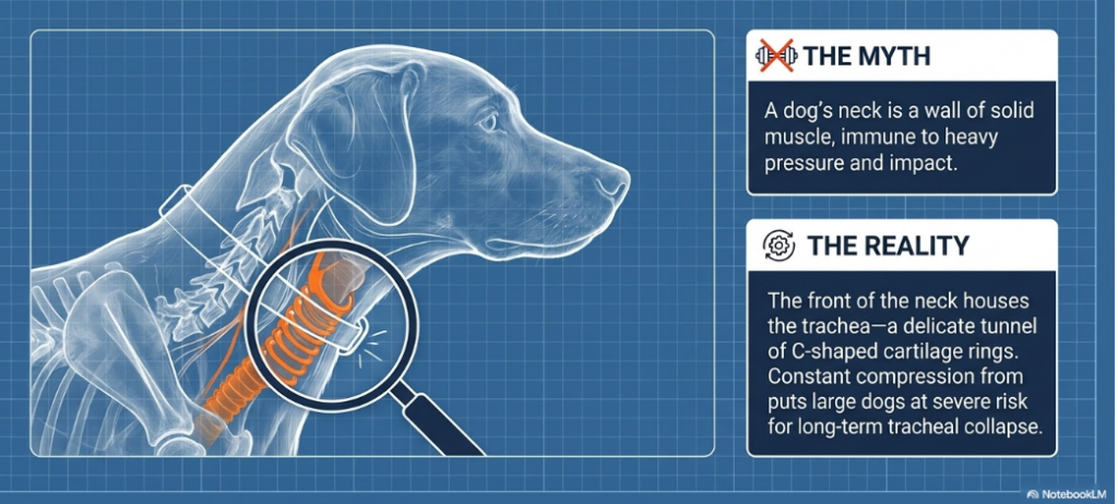 Many owners assume a dog’s neck is a wall of thick muscle. In reality, the front of the neck houses the trachea (windpipe), a series of delicate, C-shaped cartilage rings that are easily compressed. Though research varies by specific breed of dog, damage can be done by extreme pulling of a traditional collar forced upon the treachea. I prioritized Bella’s long-term health, and the data justifies that concern.